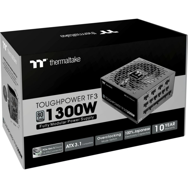 The Toughpower TF3 1300W is 80 PLUS titanium certified and compatible with ATX 3.1 specifications. Equipped with two native 12V-2x6 modular ports, it supports PCIe 12+4-pin cards such as the RTX 50 and 40 series, making it fully compatible with powerful PCIe 5.1 graphics cards.
