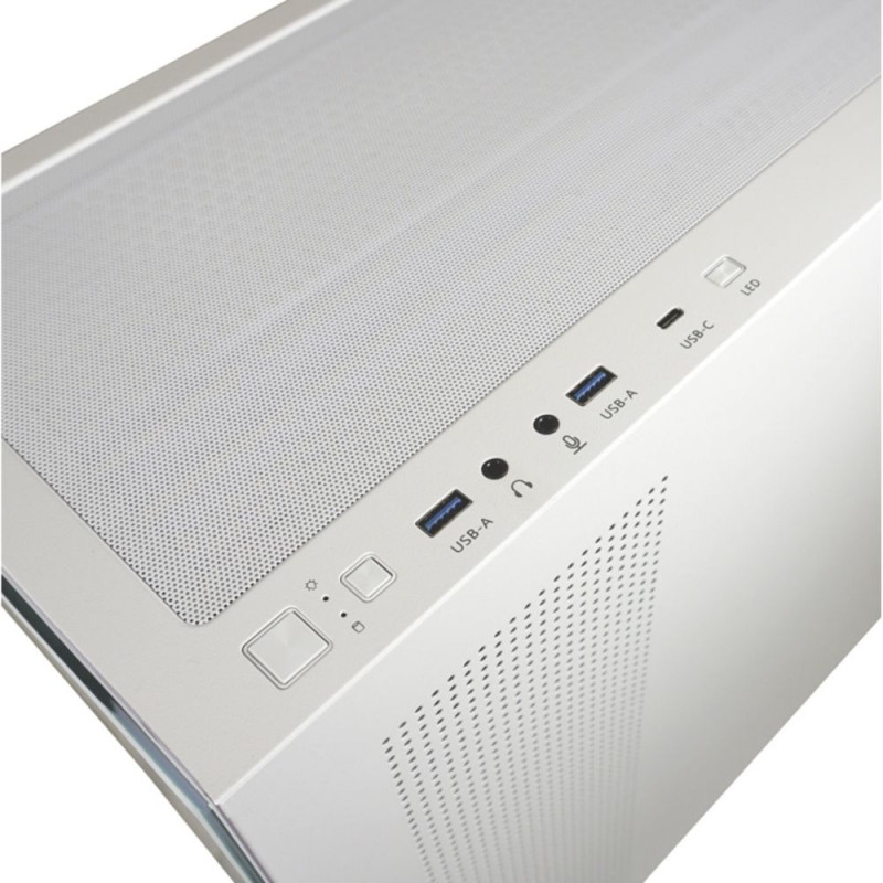 The I/O panel on the top of the case contains a power, color & reset button as well as one USB-C and two USB-A ports. In addition, the HD audio input and output can be found there, in order to be able to use corresponding audio devices quite conveniently.