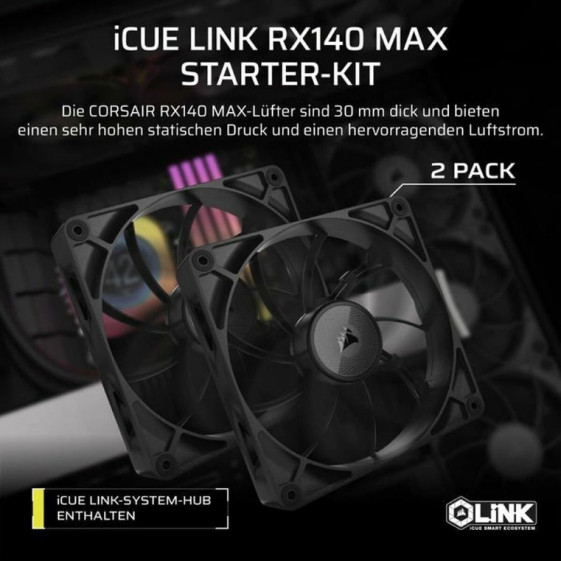 The Corsair iCUE LINK RX140 Max liquid cooling kit is an advanced solution for efficient cooling of computer systems, specifically designed to deliver optimal performance in setups requiring superior thermal management. This kit features a dual 140 mm fan with a 2" (50.8 mm) thickness, enhancing heat dissipation capacity through powerful and consistent airflow, ideal for maintaining low temperatures on key CPU components. It also integrates Corsair iCUE technology, enabling intelligent and synchronized cooling system management via software, allowing control over fan speed and RGB lighting, if present, for advanced customization. Its robust design and high-quality components ensure secure installation and compatibility with a wide range of processor sockets, providing versatility for various PC models. Although aimed at liquid cooling for desktop computers, it is important to clarify that it should not be confused with a laptop cooling pad, as its technical specifications and applications are clearly intended for high-performance systems requiring professional liquid dissipation. In summary, the Corsair iCUE LINK RX140 Max is a reliable and technically sound option within the liquid cooling range, combining power, customizable control, and durability, making it a suitable choice for enthusiasts and professionals seeking to maintain their systems at optimized thermal conditions.