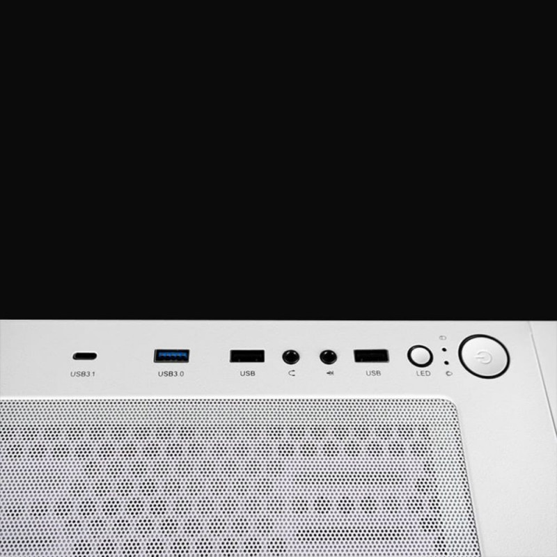 The I/O panel includes a USB-C port, three USB-A ports and an HD audio connection. A colour selection button lets you control the lighting directly on the case. This gives you quick access to all important interfaces for current devices.
