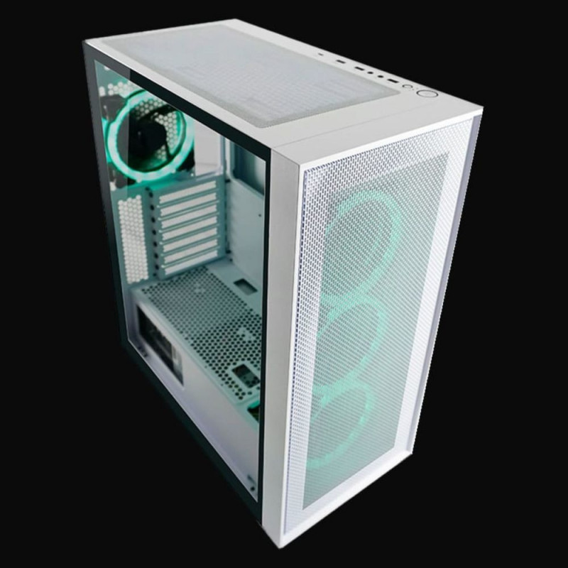 A white design with clean lines and a tempered glass side panel makes this gaming case a real eye-catcher. The painted interior creates a harmonious look, while the lighting can be customised. Graphics cards can be highlighted thanks to the vertical PCI slot installation.