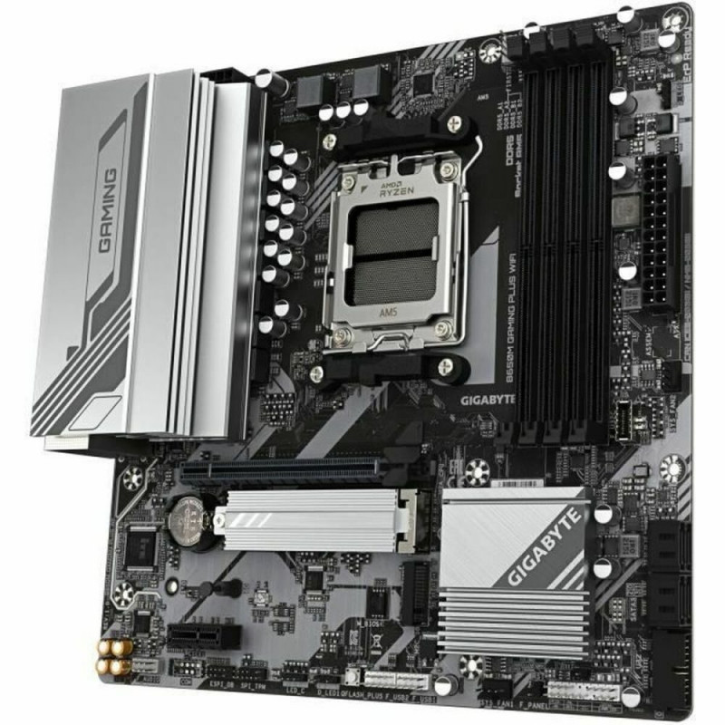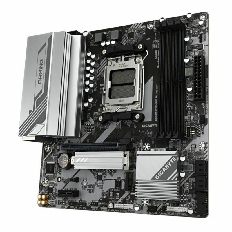 The Gigabyte B650M GAMING PLUS WF motherboard is a MicroATX motherboard specially designed to enhance desktop systems with AMD processors, featuring the modern AMD AM5 socket that ensures compatibility with the latest generation of AMD CPUs. Equipped with the AMD B650 chipset, this model offers an ideal balance between performance and features, suited for users seeking a versatile system ready for gaming or advanced tasks. Its integrated connectivity stands out, including Bluetooth and Wi-Fi, enabling stable and fast wireless connections, as well as Gigabit Ethernet for high-speed wired connections. For video output, it includes an HDMI port allowing easy connection to compatible monitors or TVs, ensuring a good audiovisual experience. Its compact MicroATX form factor allows integration into smaller cases without sacrificing expansion options or thermal management quality. Additionally, it includes a CR2032 battery to preserve essential settings and data when the system is powered off. The B650M GAMING PLUS WIFI by Gigabyte is a complete and up-to-date solution that meets the needs of users looking for a reliable motherboard with good performance and advanced connectivity to build modern, efficient systems.