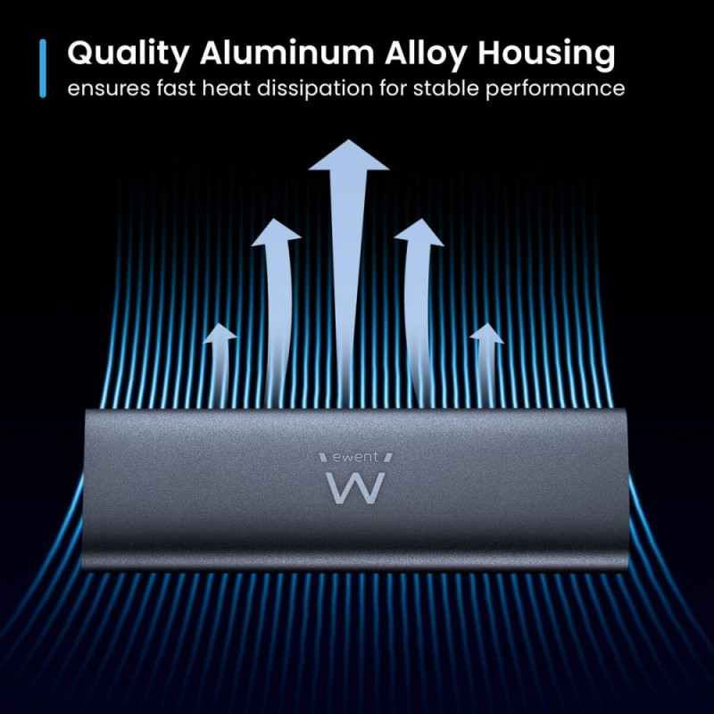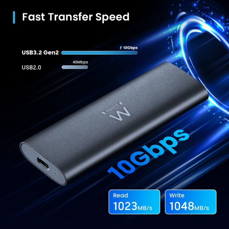 The External Hard Drive from Ewent stands out by offering an efficient and modern portable storage solution, combining a compact aluminum design with an elegant dark grey finish that aids heat dissipation and ensures durability for daily use. This unit is based on SSD technology and is compatible with M.2 NVMe PCIe modules, enabling data transfer speeds of up to 10 Gbit/s thanks to its USB 3.2 Gen 2 interface, delivering a fast experience for transferring large files and quick backups. It features universal USB connectivity and is compatible with various operating systems, making it easy to use with laptops and desktop computers without complex setup. The external enclosure format supports the installation of a single storage drive, making it an ideal choice for users looking to expand their storage capacity or securely and efficiently transport data. In summary, this Ewent external hard drive is a robust option for those who value speed, reliability, and sophisticated design in portable storage solutions.