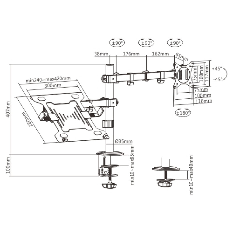 Gembird MA-DA-03 Adjustable desk mount with monitor arm and notebook tray (rotate, tilt, swivel), 17
