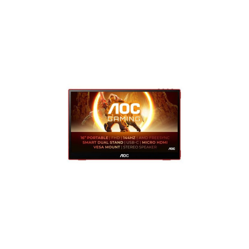 <b>AOC GAMING 16G3 is a 15.6” Full HD gaming portable monitor featuring IPS panel, fast 144 Hz refresh rate, FreeSync and full connectivity for gaming wherever you want</b><br>The AOC GAMING 16G3 is the first AOC GAMING portable gaming monitors and it combines a great gaming experience with striking visuals in a minimal and light design. The 15.6” Full HD IPS display delivers captivating colors and shadows, indoor or outdoor, with an impressive brightness of 250 cd/m2 and a contrast ratio of 1000:1. Bring the battle wherever you want and always have the upper hand: the 16G3 offers 144Hz refresh rate, FreeSync and 4ms response time for a fast-paced gaming experience, on console (microHDMI), laptops and selected smartphones (USB-C).AOC 16G3. Display diagonal: 39.6 cm (15.6"), Display technology: TFT, Display resolution: 1920 x 1080 pixels. RMS rated power: 2 W. USB port type: USB Type A/USB Type-C, USB version: 3.2 Gen 1 (3.1 Gen 1), Headphone connectivity: 3.5 mm. Product type: Portable monitor, Product colour: Black, Red, Panel mounting interface: 50 x 50 mm. On Screen Display (OSD) languages: Simplified Chinese, Traditional Chinese, Croatian, Czech, German, Dutch, English, Spanish,...