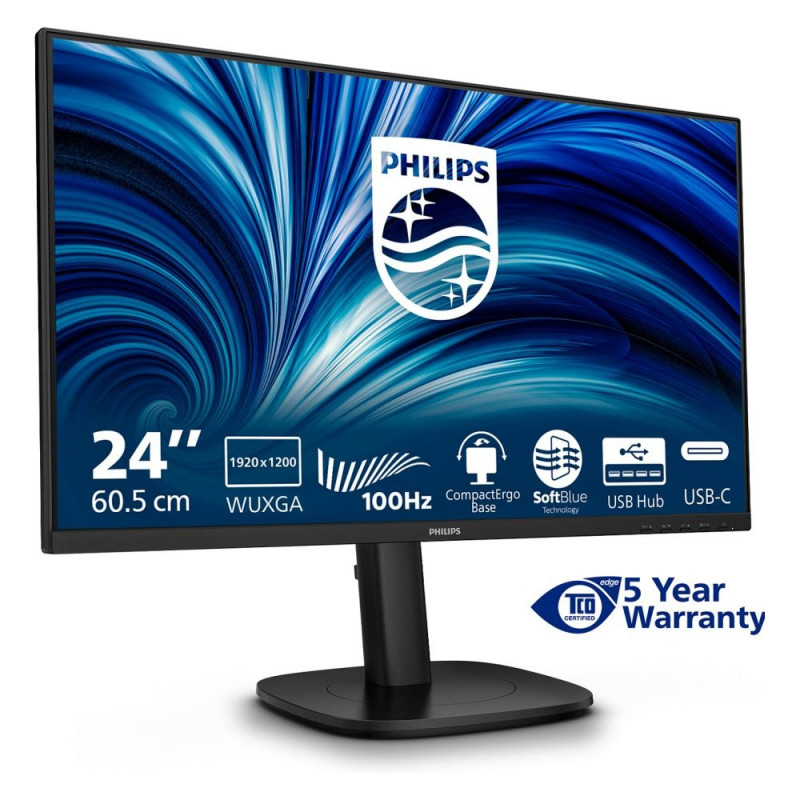 "Philips 3000 series 24B2N3200D/00. Bildschirmdiagonale: 61,2 cm (24.1""), Display-Auflösung: 1920 x 1200 Pixel, HD-Typ: WUXGA, Bildschirmtechnologie: LCD, Reaktionszeit: 4 ms, Natives Seitenverhältnis: 16:10, Bildwinkel, horizontal: 178°, Bildwinkel, vertikal: 178°. Eingebaute Lautsprecher. Integrierter USB-Hub, USB-Hub-Version: 3.2 Gen 1 (3.1 Gen 1). VESA-Halterung, Höhenverstellung. Produktfarbe: Schwarz"