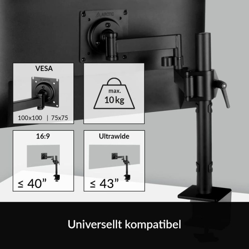 The Arctic X1 monitor desk mount, model AEMNT00061A, is an accessory designed to provide a practical and sturdy solution for positioning monitors weighing up to 10 kg. Made of black steel, it ensures durability and stability, offering a discreet and elegant presence in any workspace. Its design includes two compatible VESA mounting formats, 10 x 10 cm and 7.5 x 7.5 cm, making it adaptable to a wide range of screens. It also features an adjustable tilt and swivel capability, allowing ergonomic positioning to improve visual comfort and reduce fatigue during long hours in front of the monitor. It stands out for its integrated cable management system, which helps keep the workspace tidy and free of clutter. These technical features, combined with a solid structure, make the Arctic X1 a versatile and functional mount suitable for both professional environments and home use. Its simple yet effective design facilitates quick installation and adjustment, optimizing desk space without compromising equipment safety. Overall, the Arctic X1 mount is a reliable solution for users needing a well-finished, adaptable, and sturdy monitor stand, ensuring agile and secure device handling.
