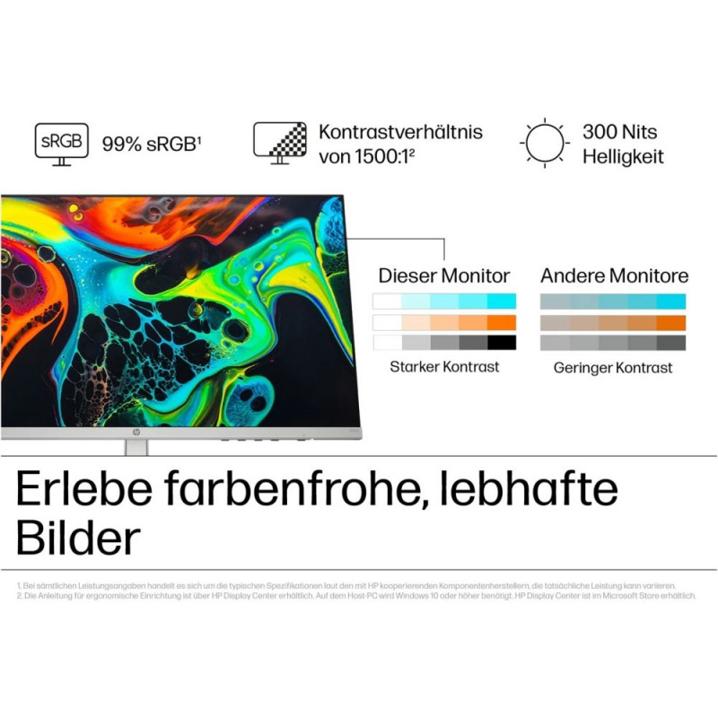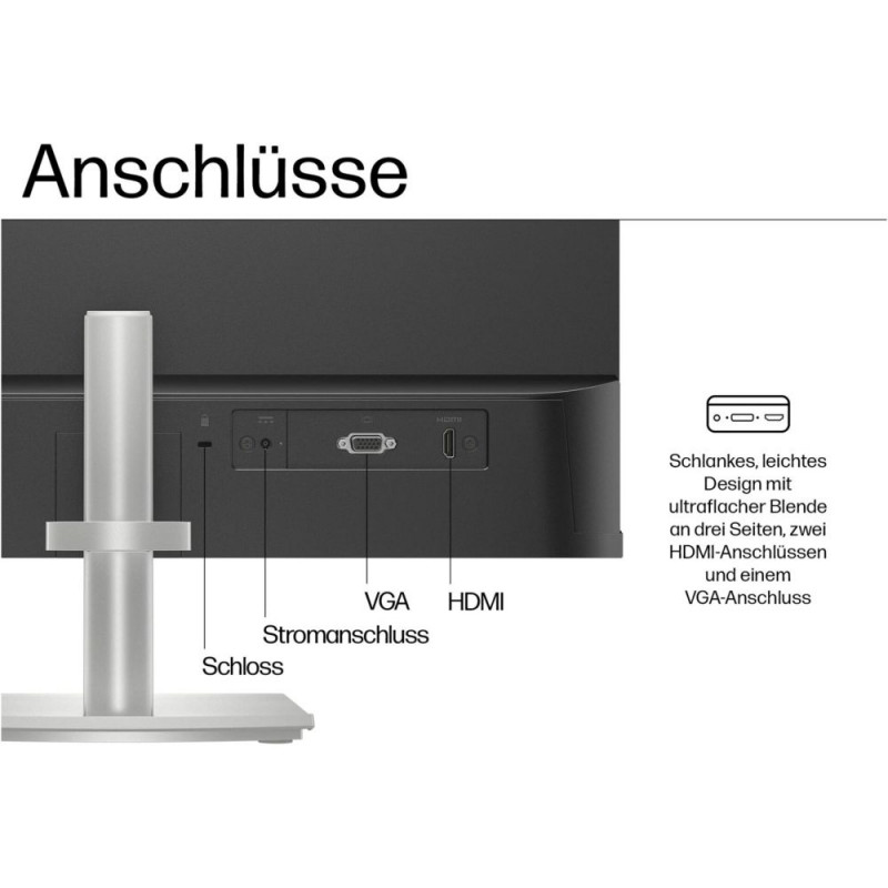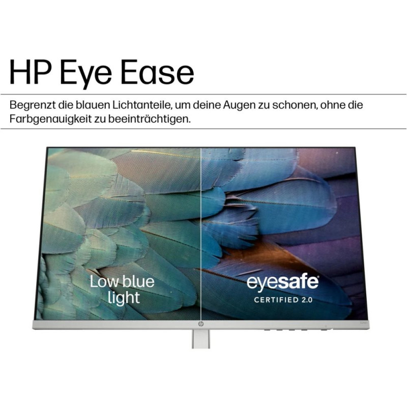 HP Eye Ease reduces blue light without significantly altering colour reproduction, which benefits you during long working days. The flicker-free display supports a more comfortable viewing experience. Connections such as HDMI and VGA allow you to connect various devices flexibly. With its compact stand, the monitor fits well on smaller desks.