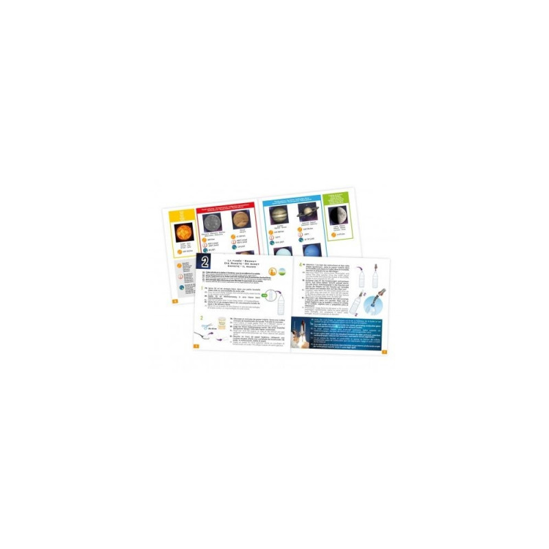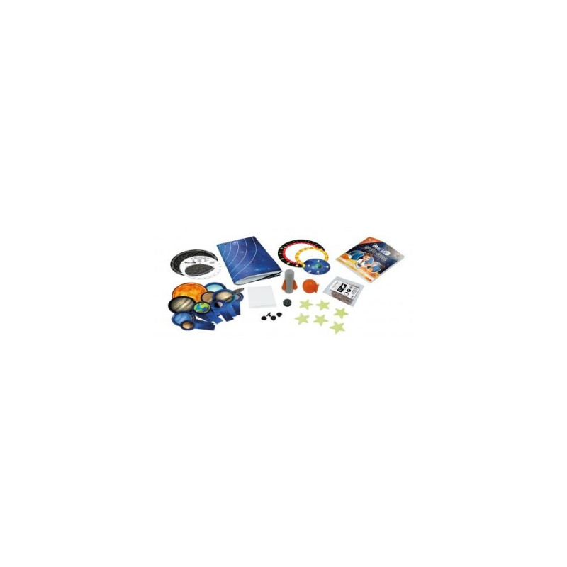 Included : foam rocket, compass, meteorite ball mould, powder for meteorite ball, 6 phosphorescent stars, constellation maps, lunar calendar, 10 celestial bodies, solar system poster, 2 clips, adhesive strips, illustrated guide to the activities.