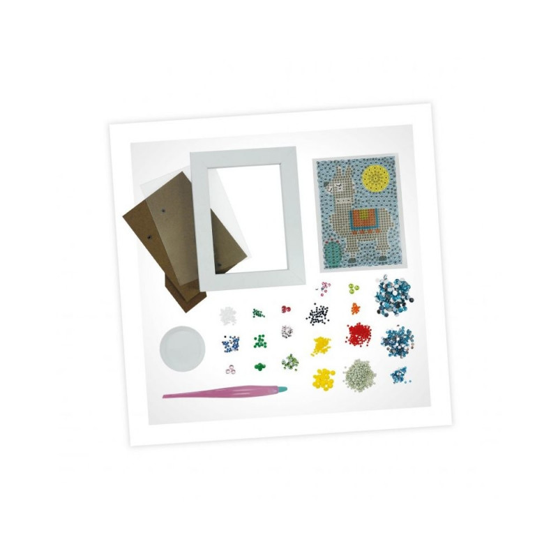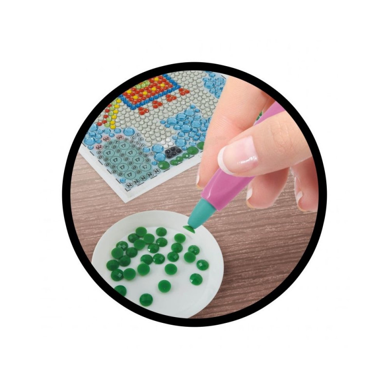 Included : 1 self-adhesive board, assortment of diamante, 1 wax tip stylus, 1 small tray, bags for storing the diamante, 1 wooden frame.
