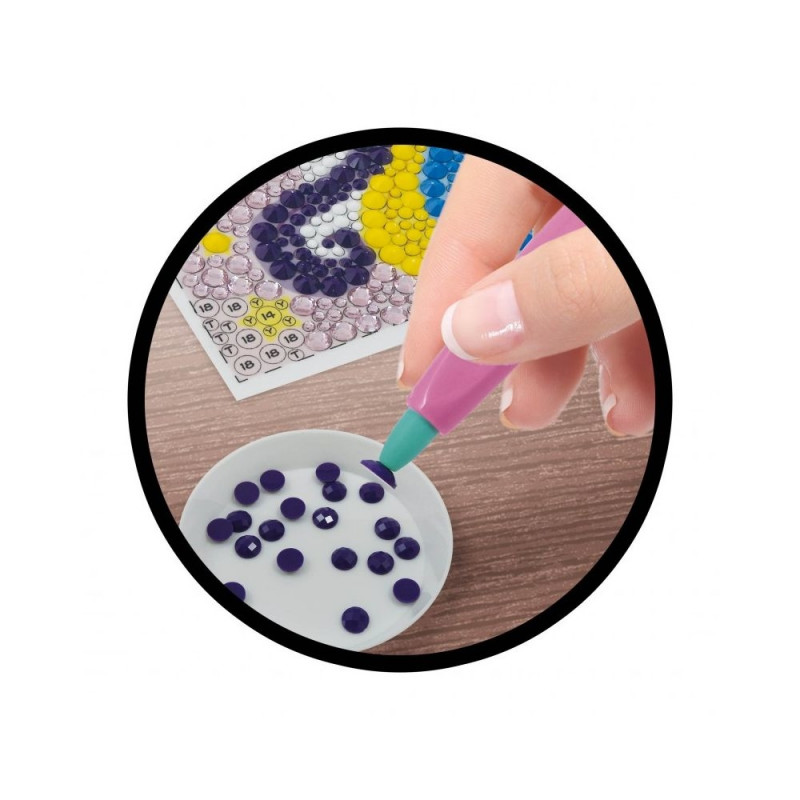 Included : 1 self-adhesive board, assortment of diamante, 1 wax tip stylus, 1 small tray, bags for storing the diamante, 1 wooden frame.