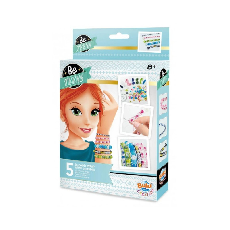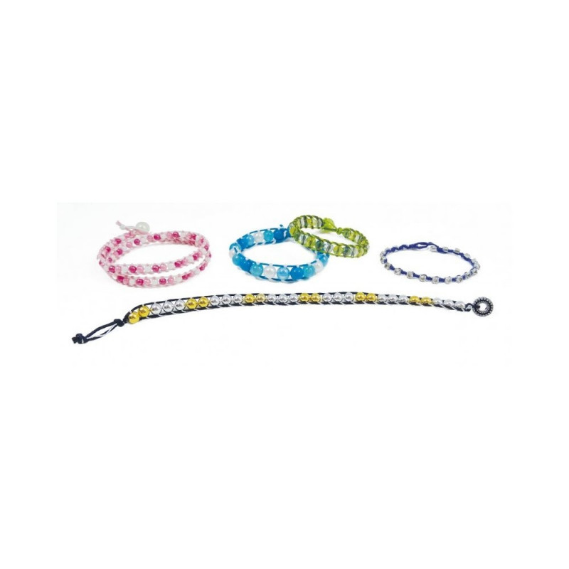 Included : assorted beads, chain (15 cm), 1 needle, 1 brown waxed thread (70 cm), 1 blue waxed thread (70 cm), 1 green waxed thread (70 cm), 1 white waxed thread (140 cm), 1 white cotton thread (120 cm), 1 green cotton thread (120 cm), 1 silver cotton thread (120 cm), 1 purple cotton thread (120 cm), 1 pink cotton thread (240 cm), 1 instruction sheet in colour.