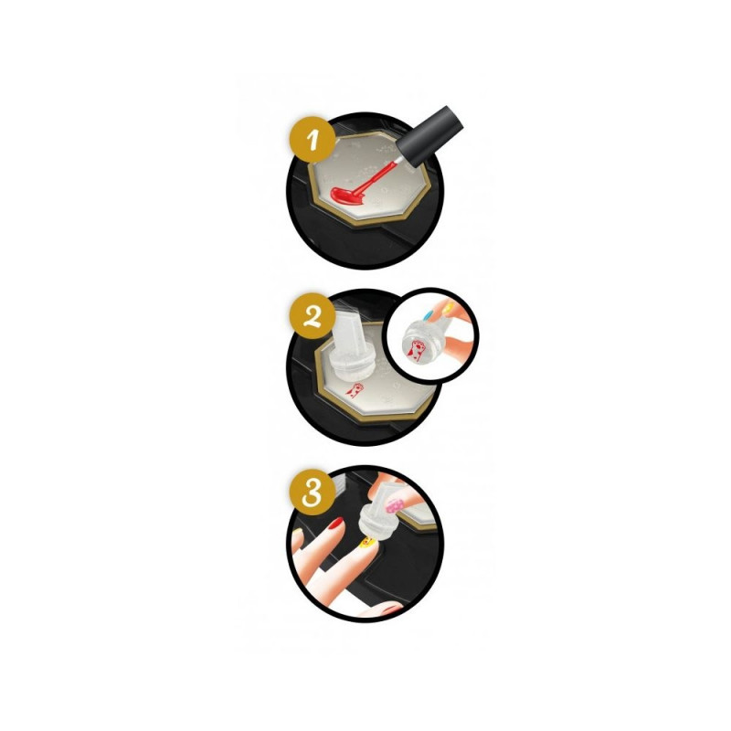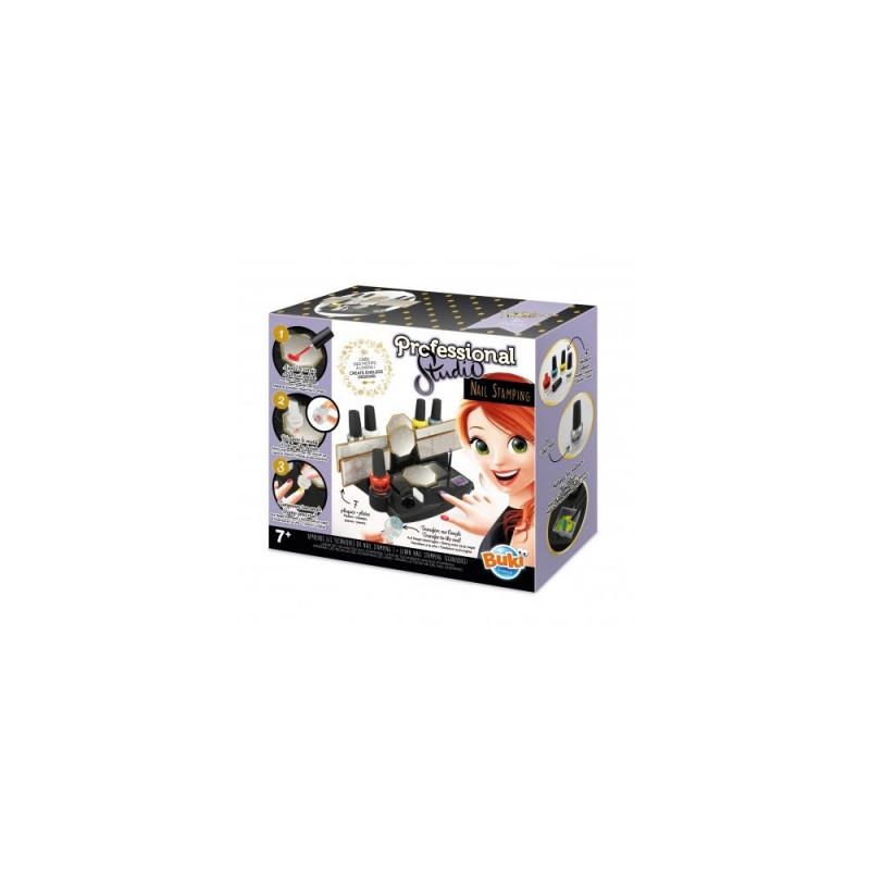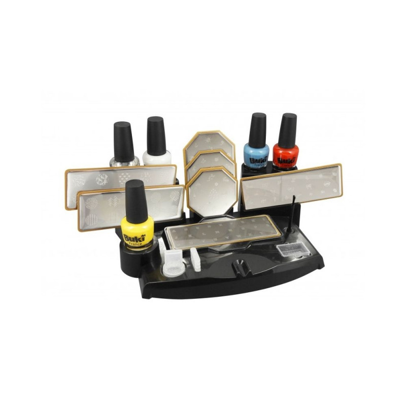 Included : 1 studio with storage, 4 polishes, 1 top coat, 7 stainless steel plates, 1 silicone stamp and 1 instruction sheet with colour illustrations.