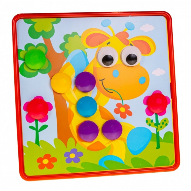 Każdy obrazek ma dziurki z kolorowymi obwódkami. Obwódki podpowiadają, jaki kolor mozaikowego grzybka należy w niej umieścić.