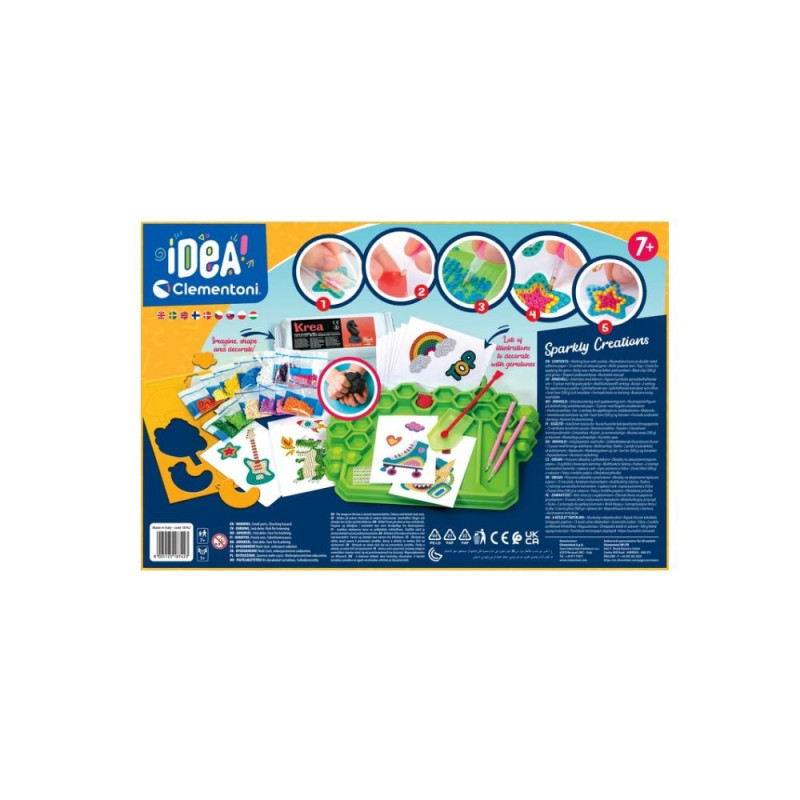 W zestawie ilustrowana instrukcja, objaśniająca dzieciom każdy etap, oraz specjalne pióro do chwytania kamyków i kolorowe, ponumerowane kartki, aby ułatwić naklejanie kryształków.