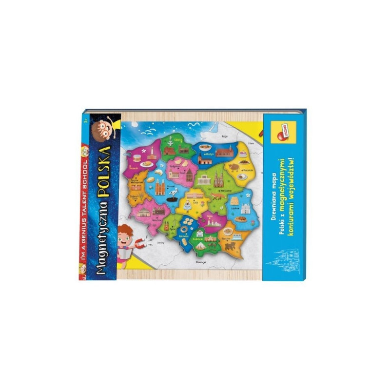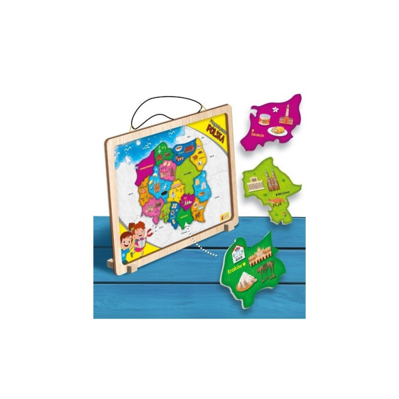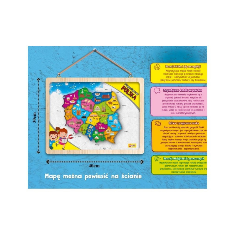 Wyjątkowa magnetyczna mapa Polski, która pozwala odkryć wszystkie jej tajemnice! Każdy element reprezentuje inny region kraju i zawiera pomniki kultury, które pozwalają dzieciom poznać wszystkie tajemnice i charakterystyczne elementy naszego kraju.