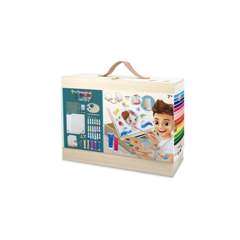 Accessories included: 1 artist’s apron, 2 thin canvases A4 format, 5 sheets of 230 g A4 paper, 2 metal clips to hold them in place, 12 paint brushes of different shapes and sizes, 1 eraser, 1 HB pencil, 1 2B pencil, 1 wooden palette with cup, 18 tubes containing 22 ml of acrylic paint and 5 tubes containing 20 ml of glitter paint.