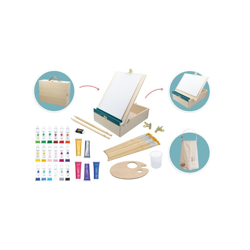 Put on your apron and learn the techniques of acrylic painting, with this wooden art box that converts into an easel.