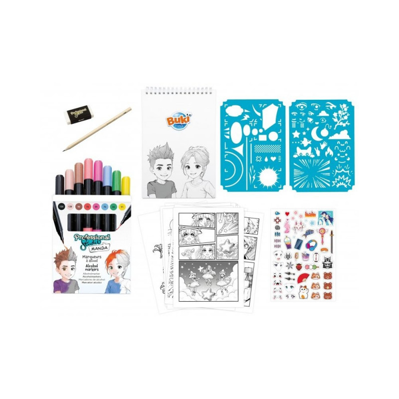 Included : 1 A5 size book with 25 detachable sheets, including 15 manga colouring sheets and 10 blank sheets, 8 alcohol-based markers, 1 pencil, an eraser, 2 stencil sheets, 1 sticker sheet and 1 illustrated instructions.