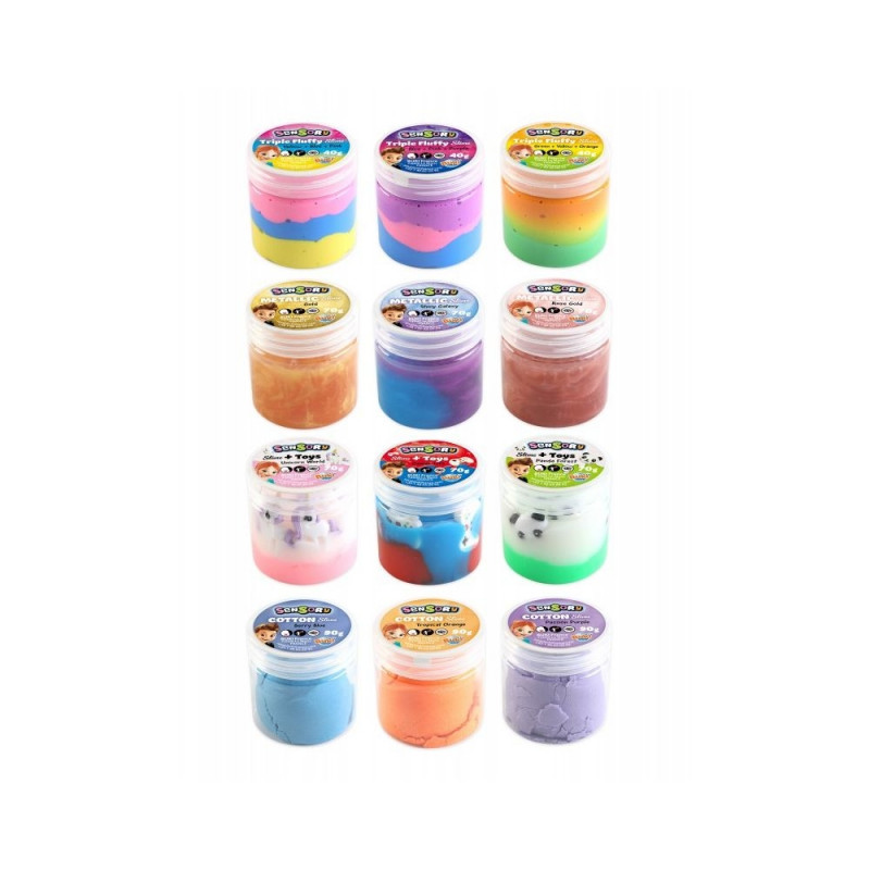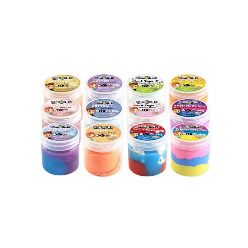 Experience the fluffy feel of Cotton slime. Admire the shiny reflections of Metallic slime. Blend shades with Triple Colour slime.
