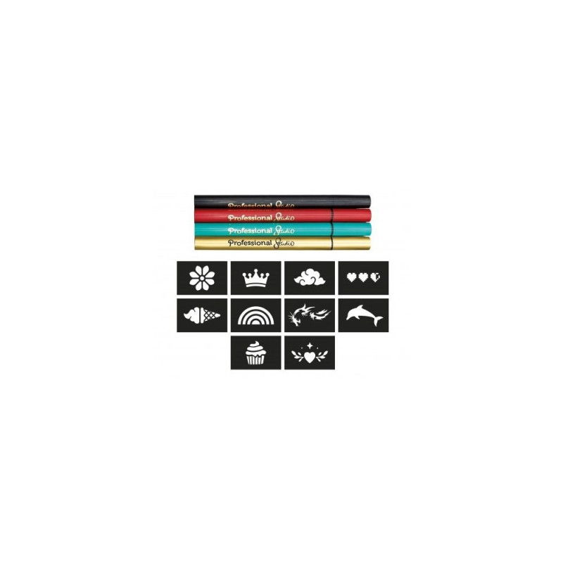 Included: 4 tattoo pens and 10 repositionable stencils and 1 instruction sheet with colour illustrations.