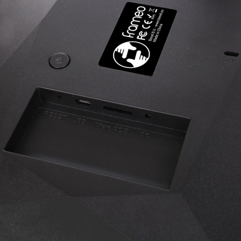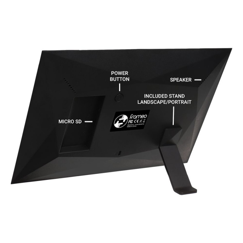 Frameo's HF-101B is a black digital picture frame with a 10.1-inch IPS screen. The special feature of the Frameo is that you can use a smartphone app to wirelessly place photos on the Frameo. Place the Frameo centrally in your living room and enjoy the most beautiful photos taken by you and your family. Operation is very easy, due to the touch-sensitive screen and the Android operating system. The HD resolution of 1280 by 800 pixels ensures sharp and vivid pictures. The dimensions of the screen are 21.5x13.3 cm. Including border, the Frameo measures 26,3x18,3 cm. The Frameo is 2.3 cm thick. A wide viewing angle makes it possible to view photos from the entire living room. On the Frameo's internal memory you can place more than 1000 photos. It is also possible to import photos or make a backup with a micro SD card or USB stick. You place the Frameo both horizontally and vertically on a table with the included leg.