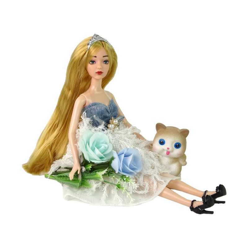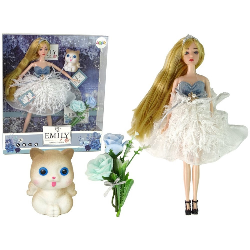 Przedstawiamy uroczą lalkę Emily z długimi, blond włosami, ubraną w elegancką suknię zdobioną brokatem i materiałem przypominającym piórka. Jej włosy zdobi tiara, a niebieskie oczy dodają uroku. Emily ma na nogach piękne, czarne buty na obcasie ozdobione różą.