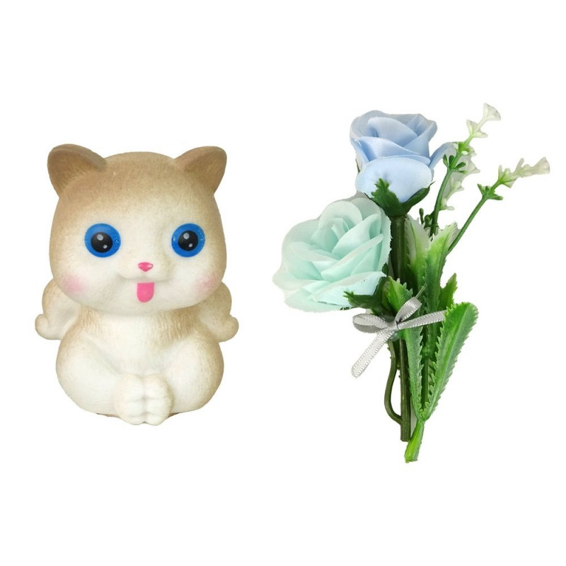W zestawie znajduje się również beżowy kotek o wymiarach 6 cm x 4 cm x 5 cm. Dodatkowo zestaw zawiera piękne kwiaty pasujące do stylizacji Emily.