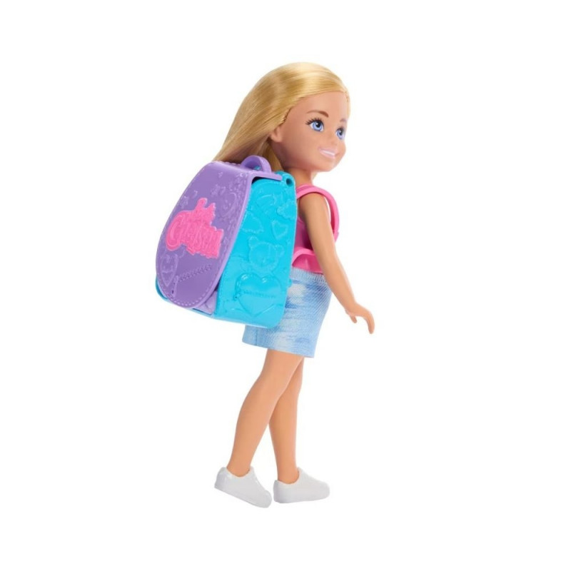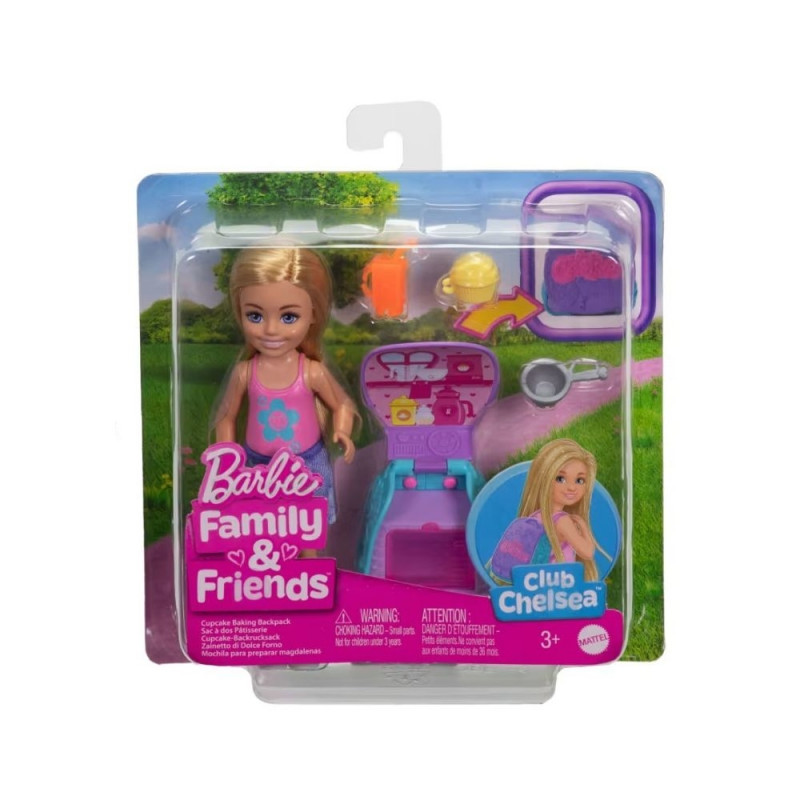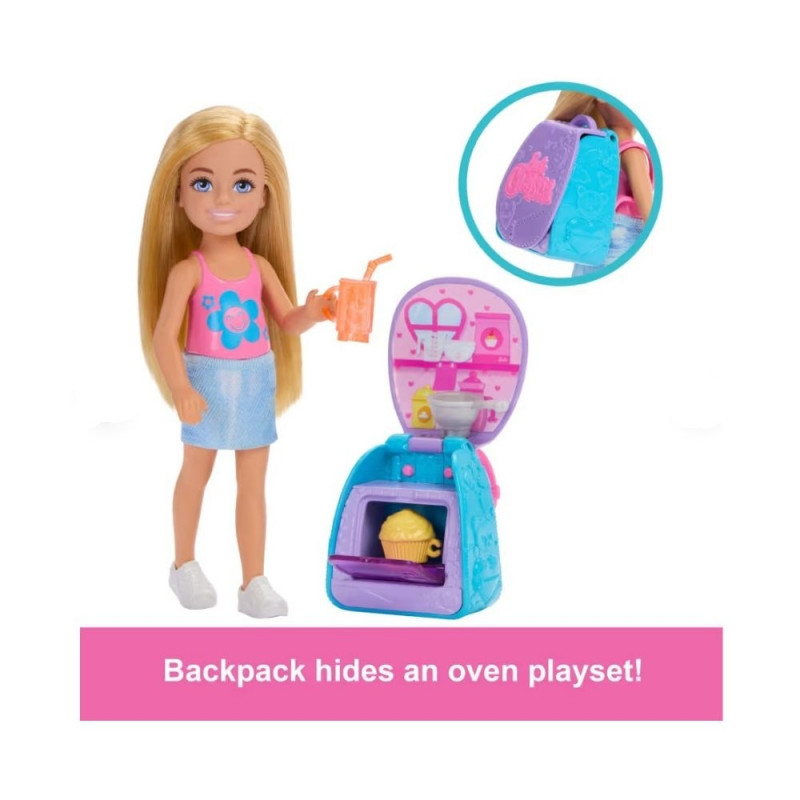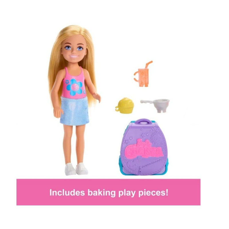 Chelsea i jej plecak są gotowe do pieczenia! Otwórz plecak Chelsea, a niespodzianka: może użyć piekarnika do upieczenia babeczki! Plecak zmienia się w zestaw do zabawy! Chelsea ma również miskę do mieszania, która pomaga jej w pieczeniu, oraz napój do picia! Sprzedawane oddzielnie, w zależności od dostępności. Lalka nie może stać samodzielnie. Kolory i dekoracje mogą się różnić.