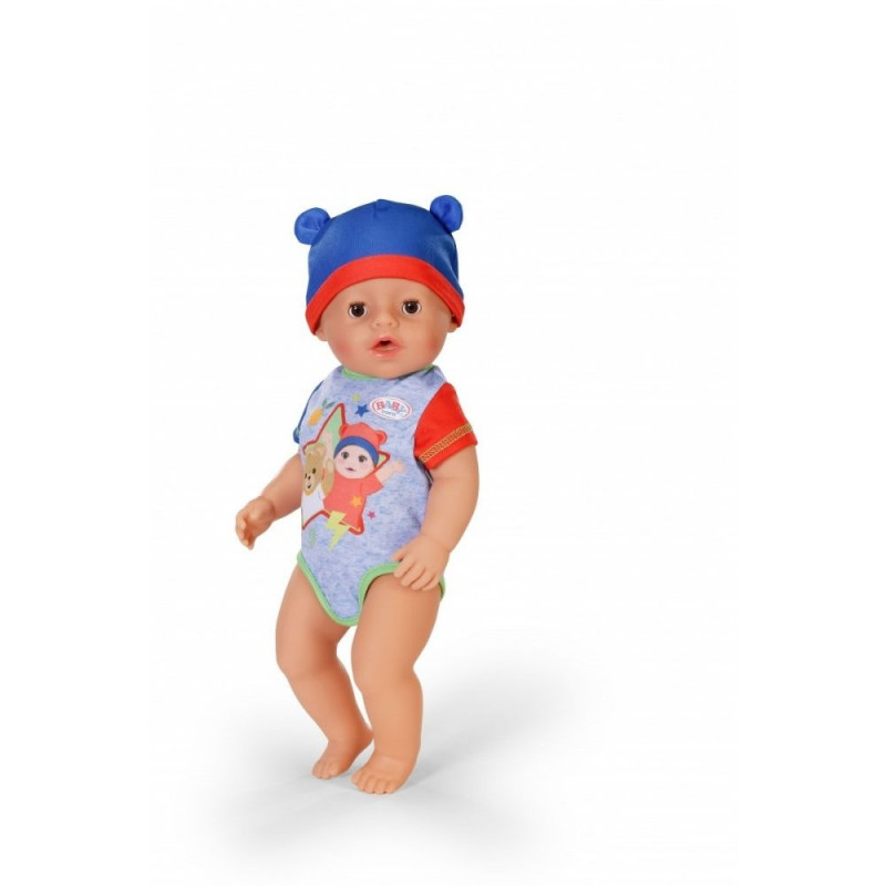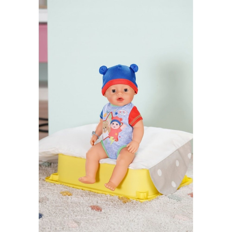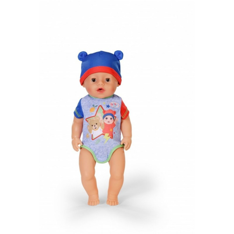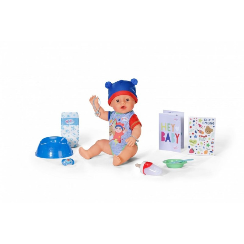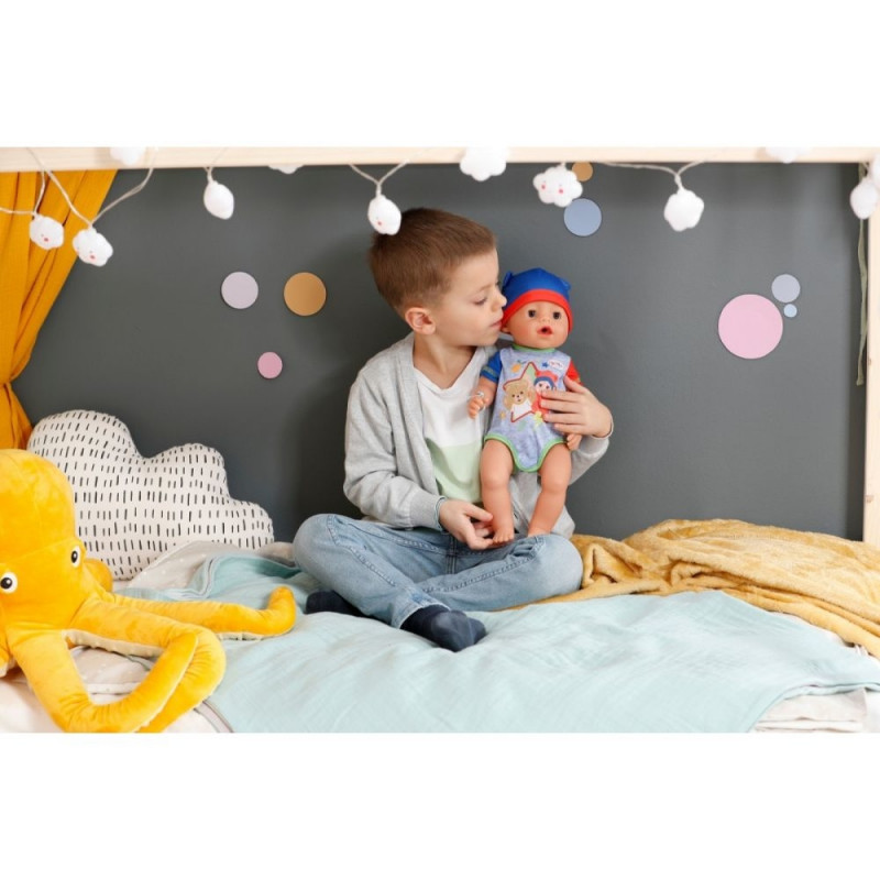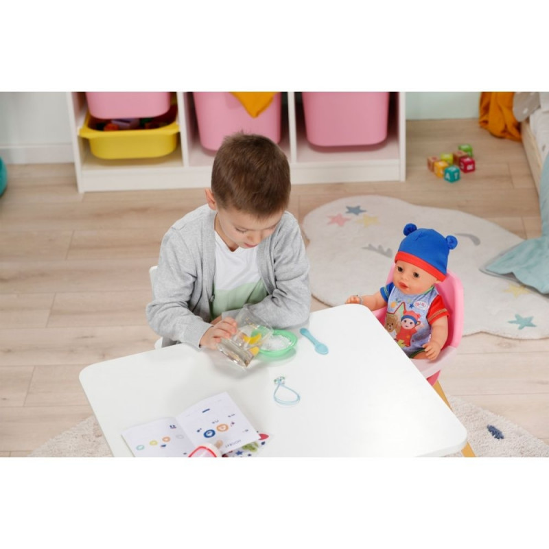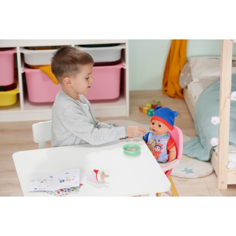 BABY born Jonas 43 cm - bohatera znanego z popularnego animowanego serialu BABY born, który teraz pojawia się w nowym ubranku i z zestawem aż 10 akcesoriów, gwarantujących długie godziny kreatywnej zabawy. Wśród nich znajduje się magiczny talerzyk, na którym po wlaniu wody pojawiają się apetyczne potrawy - to efekt magicznej wody, który sprawia, że zabawa w karmienie staje się jeszcze bardziej realistyczna i ekscytująca. Po posiłku lub piciu z butelki można posadzić Jonasa na nocnik i nacisnąć jego brzuszek, by zrobił siusiu lub kupkę, jak prawdziwe dziecko. Gdy pije wodę, potrafi nawet zapłakać i wymaga czułego przytulenia. Pomaga w tym magiczny smoczek, który po obróceniu o 180 stopni otwiera lub zamyka oczy lalki - a gdy Jonas zostanie położony do snu, sam zamyka oczy również bez smoczka. Lalka jest bardzo elastyczna i nadaje się do kąpieli - schnie szybciej niż kiedykolwiek, a dzięki możliwości wyjęcia jednej nogi czyszczenie jest wyjątkowo proste. W zestawie z Jona sem znajduje się butelka, smoczek, magiczny talerzyk, łyżeczka, jedzenie, nocnik, pieluszka, akt urodzenia oraz dwie bransoletki przyjaźni - jedna dla dziecka, druga dla lalki - symbolizujące wyjątkową więź i wspólne chwile zabawy. BABY born Jonas 43 cm to gwarancja niezawodnej jakości i radości, jaką marka BABY born dostarcza dzieciom już od 1991 roku.