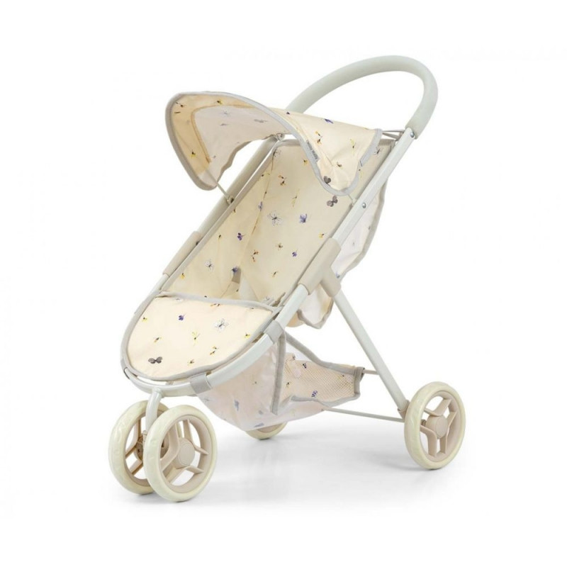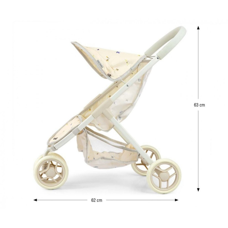 Susie is a three-wheeled stroller designed for dolls up to 50 cm long. A double front wheel allows for smooth changes in direction. The stroller features a three-point seat belt and a basket for essential accessories, including baby formula bottles, clothes, and diapers. It also features a foldable hood.
