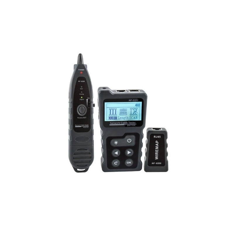 Specifications: Test cable type: CAT5e / CAT6a / CAT6 (STP + UTP). Power supply: battery 6R22, 9V (not included) and AAA batteries x3 (not included). Max range (wiremap and scan): 600m. Cable length test range: 2.5 m ~ 200 m. Cable length accuracy: +/- 1.6m. Scan max signal voltage 9+/-1V p-p. Scan frequency: 130KHz. Length breakage location: yes. Analog / digital mode: yes. PoE test range: DC 5-60V standard / non-standard PoE switch. PoE voltage display: yes. PSE type: standard: IEEE802.3af / IEEE802.3at; non-standard. Voltage protection: DC 48V 5mA. LCD display: 128x64 dot-matrix with backlight. Max. emitter working current: <150mA. Adjustable sensitivity: yes. AC voltage detecting: yes. Max. receiver working current: <100mA. Remote control port: RJ45. Dimensions: Emitter: 125mmx68mmx28mm. Receiver: 210mmx43mmx27mm. Remote: 65mmx37mmx23mm.