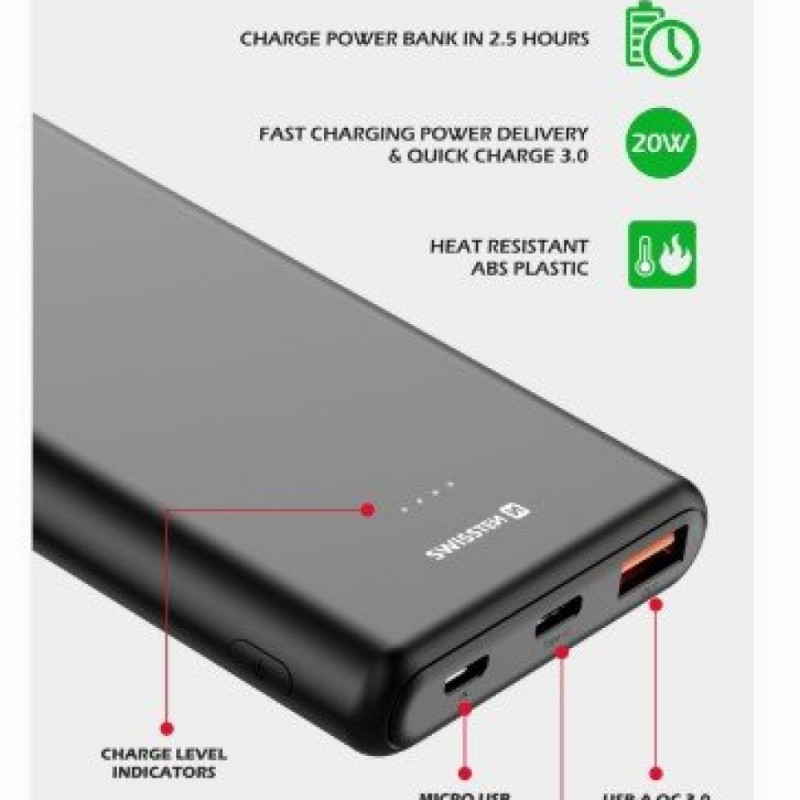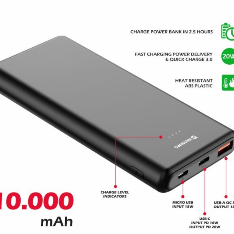 SWISSTEN 10,000 mAh power bank with microUSB and USB-C inputs, USB-A and USB-C outputs and PD and QC fast charging. Fast charging The power bank is equipped with Quick Charge 3.0 fast charging and Power Delivery technology. This significantly sWarning: Last items in stock!