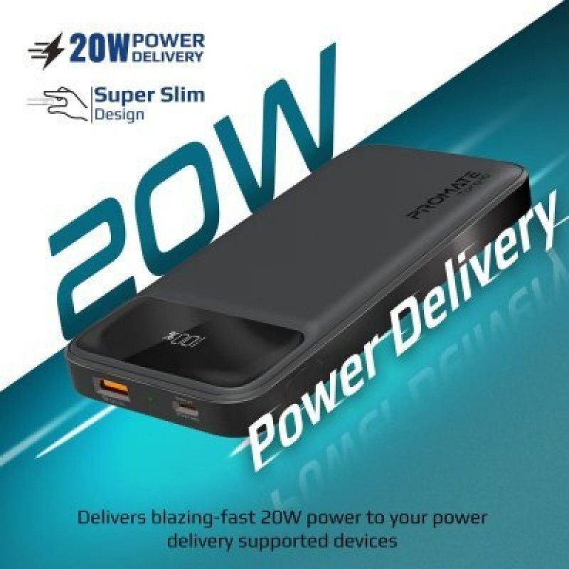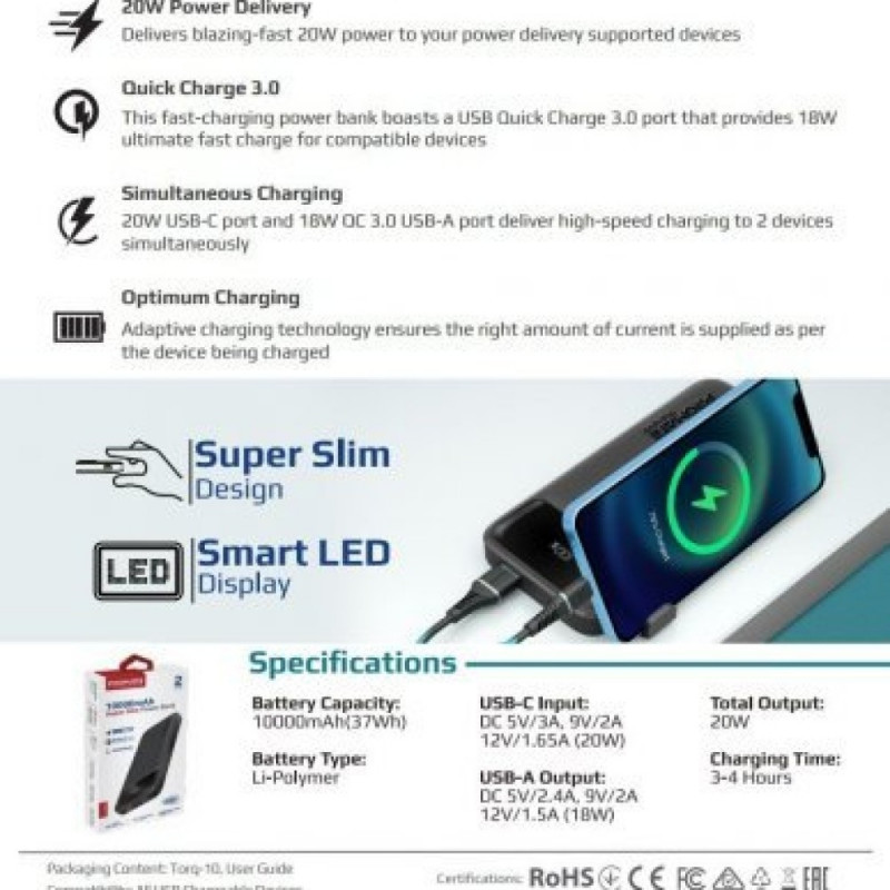 Promate Torq-10 is an ultra-slim 10,000mAh power bank with 20W power supply and 18W Quick Charge 3.0 that will charge your devices quickly. The LED display and smartphone holder will add practicality in daily use.