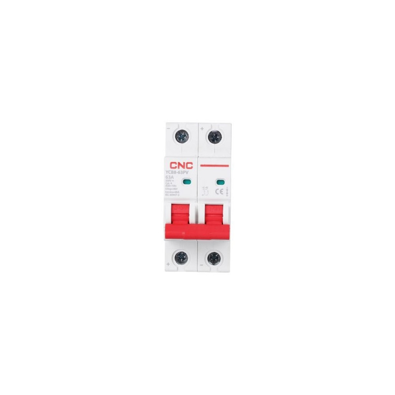 Technical data:Number of poles: 2.Nominal current (In): 63 A.Class: A.Rated voltage (Ue): DC 500 V.Insulation voltage (Ui): 1200 V.Ultimate breaking capacity (Icu): 6000 A.Rated impulse withstand voltage (Uimp): 4000 V.Tripping type: thermomagnetic.Mechanical life: 20000 times.Electrical life: 1500 times.Safety class: IP20.Wire cross-section area: 2.5 - 25mm².Installation: on a DIN rail (35mm).Operating temperature: -35°C~+70°C.Storage temperature: -40°C~+85°C.Dimensions: 71.2 x 82 x 36 mm.Standards: IEC 60947-2 / EN 60947-2.