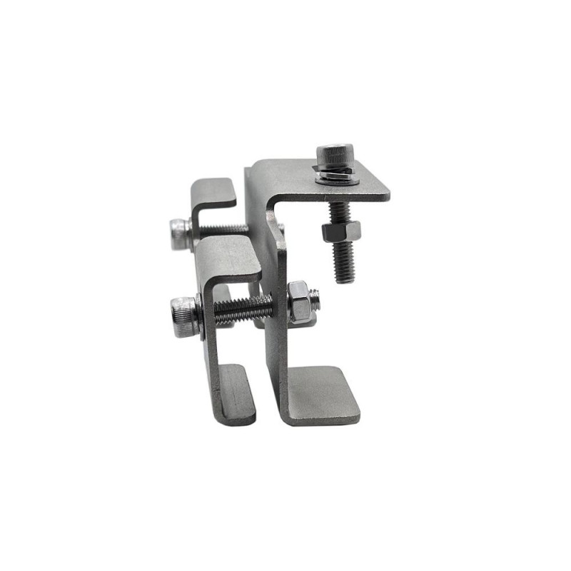 Technical specifications: Material: Stainless steel A2-70, grade 304. Application: Standing seam sheet metal roofing. Bracket dimensions: 140x67x73 mm. Bolt dimensions: Ø7.5 mm x 49 mm. Bracket weight: 333 g. Total weight: 489 g (with bolts). Set contents: 2 bracket parts, 3x bolts, 3x nuts, 3x flat washers, 3x spring washers.
