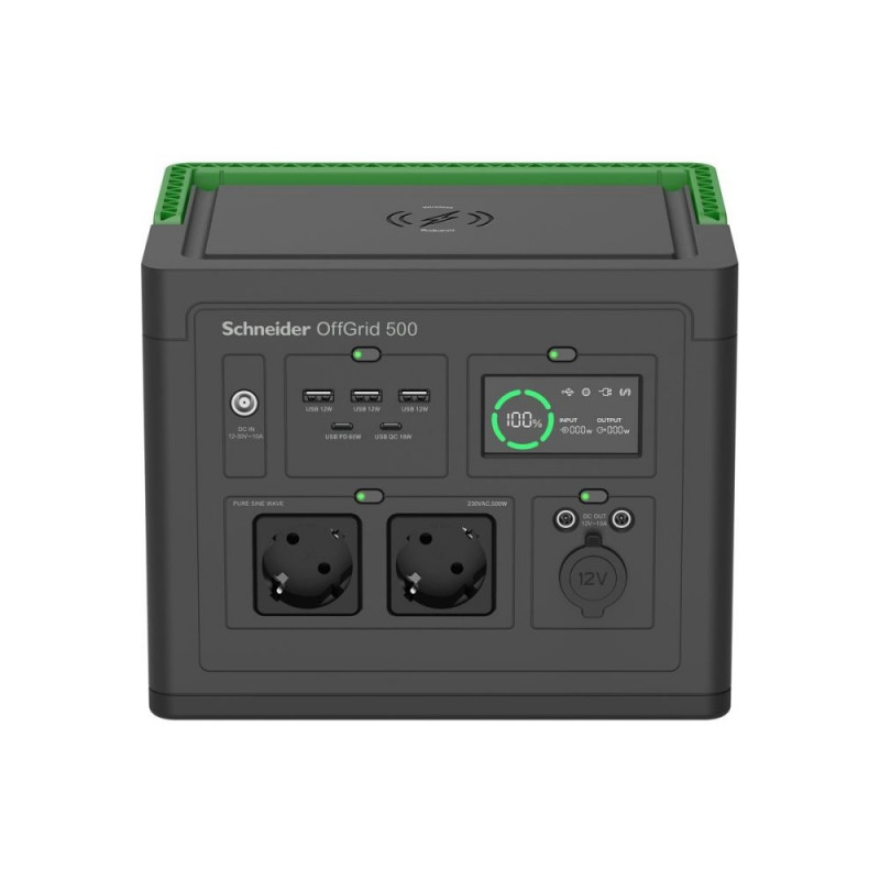 | Product Description | Schneider OffGrid 500 - portable power station - LCD, lithium-ion, 2 CEE 7/3 Schuko outlets, sinewave, 3 USB-A, 2 USB-C, wireless charger - 500 Watt - Li-Ion - 517 Wh |