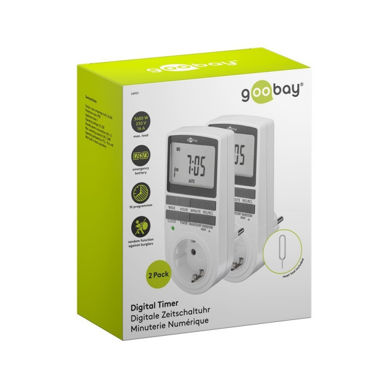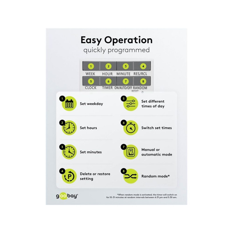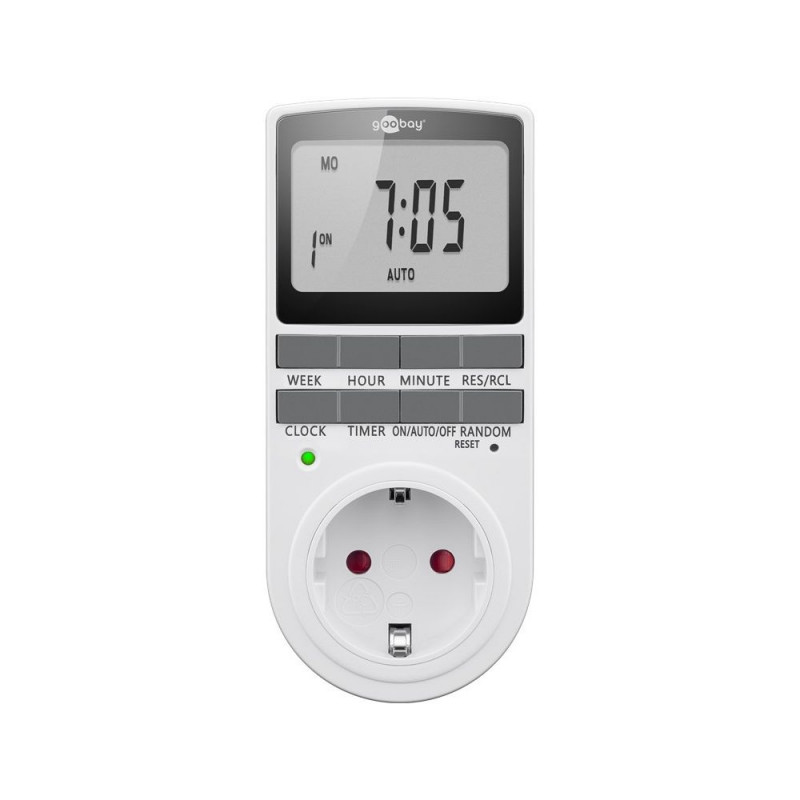 | Description | Automate your home with the highly flexible timer from Goobay: Easily and automatically switch the power on and off on your bathroom heater, grow lights, terrariums or outdoor lighting. The random mode makes you feel safe even when you are away and deters |