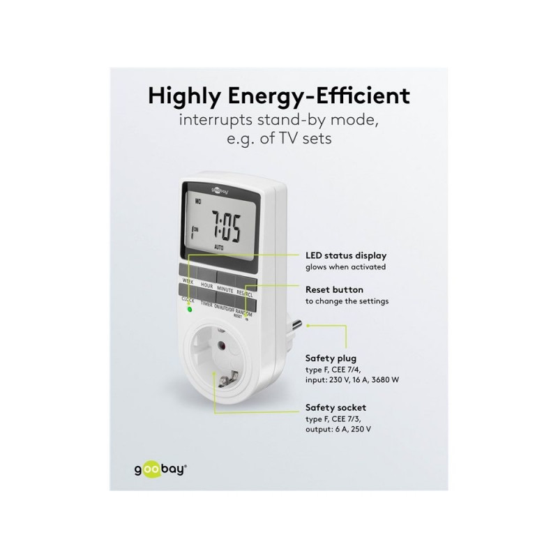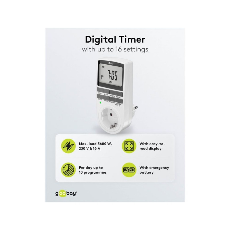 | Description | Automate your home with the highly flexible timer from Goobay: Easily and automatically switch the power on and off on your router, bathroom heater, grow lights, terrariums or outdoor lighting. The random mode makes you feel safe even when you are away an |