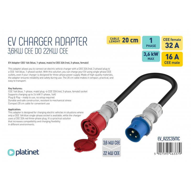 The adapter allows you to connect an electric vehicle charger with a CEE 32 A plug to a CEE 16 A socket. Thanks to this, you can charge your vehicle even in places where only a 16 A socket is available.