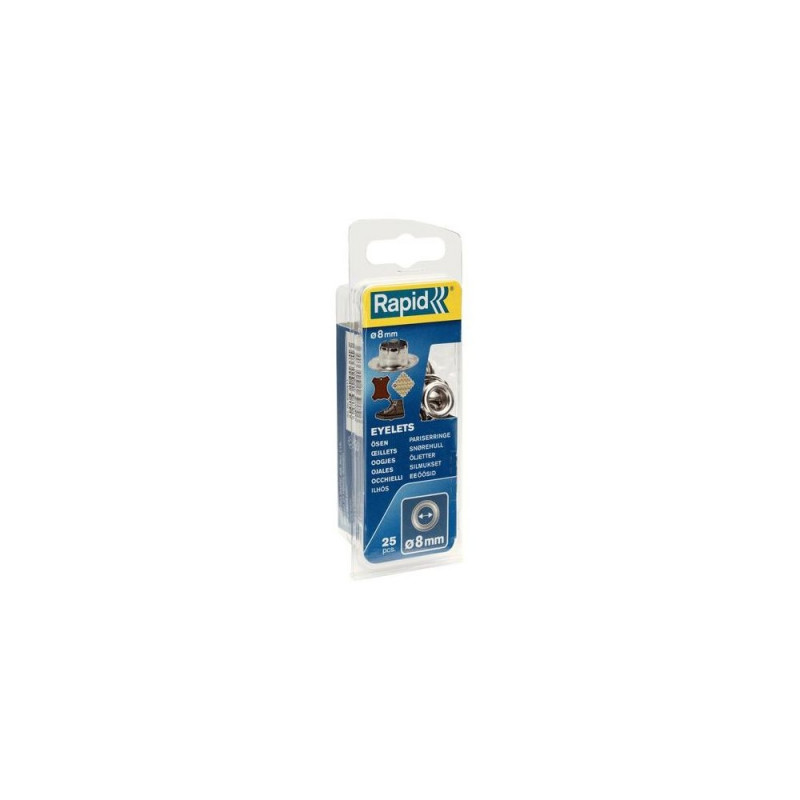 High quality eyelets specially created for effective application to textile, leather, shoes and canvas.Rapid 5000411. Product type: Eyelet, Material: Stainless steel, Product colour: Silver. Inner diameter: 8 mm, Package width: 35 mm, Package depth:Warning: Last items in stock!