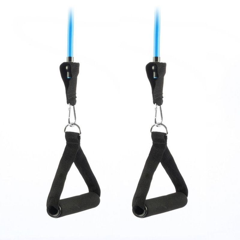 A set of 3 adjustable resistance bands in various colours (according to their intensity level) which includes an exercise guide, carry bag and accessories to perform a multitude of exercises for the arms, shoulders, chest, glutes, legs, etc. The elastic bands can be used together or separately, they have foam handles and metal carabiners for optimum grip and hold. Thanks to their portable design and carry bag, they can be easily used anywhere.