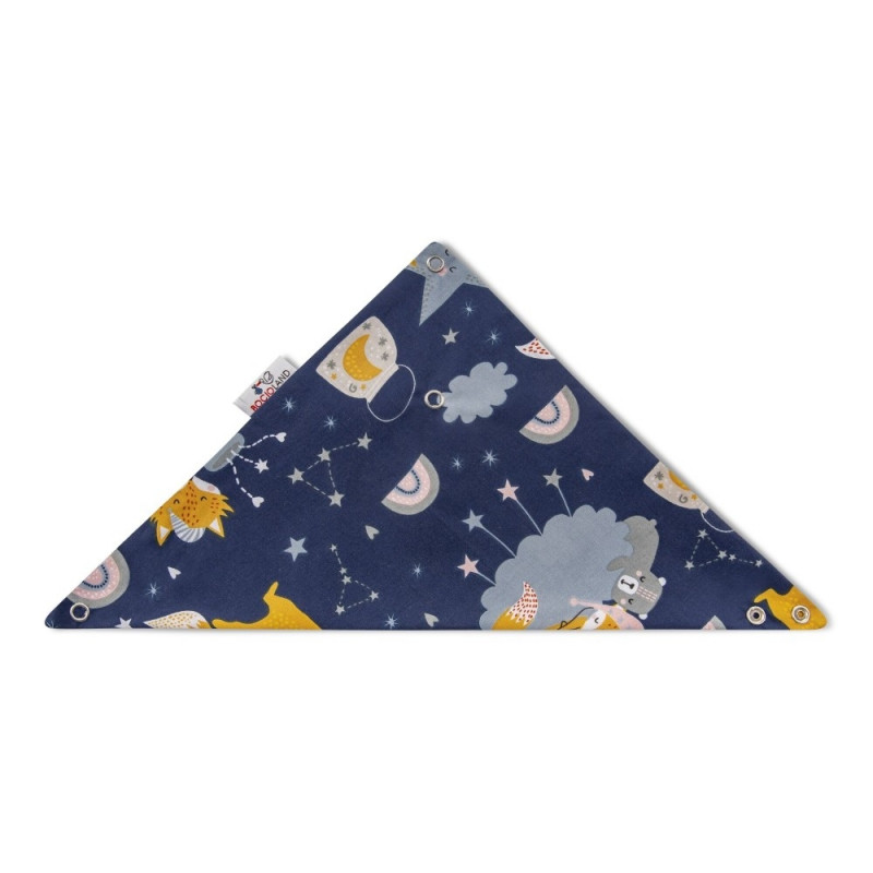 Due to its shape and the way it is made, it fulfills two functions. It is both a bib and covers the baby's clothes while feeding, and it is also a scarf / bandana for the baby, protecting the neck, constituting an element of the baby's clothing. The product is made of two layers of 100% cotton material.