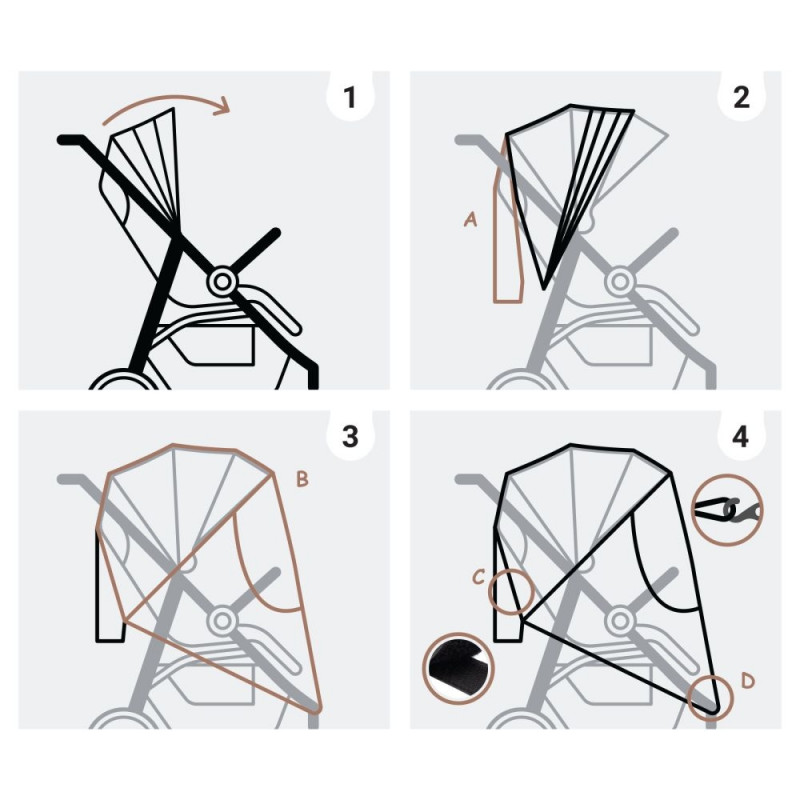Do not place additional objects on the cover or use it as a storage surface. Exercise extra caution in strong winds – an unsecured stroller may become unstable.