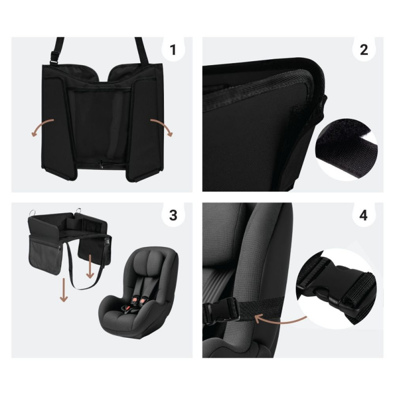 Place the tray on the child’s lap while they are seated in a car seat or booster. Then loop the securing strap around the back of the seat and fasten the buckle. Adjust the strap to ensure the tray is stable but does not restrict the child’s movement. After use, unbuckle the strap and fold the tray into a compact form.