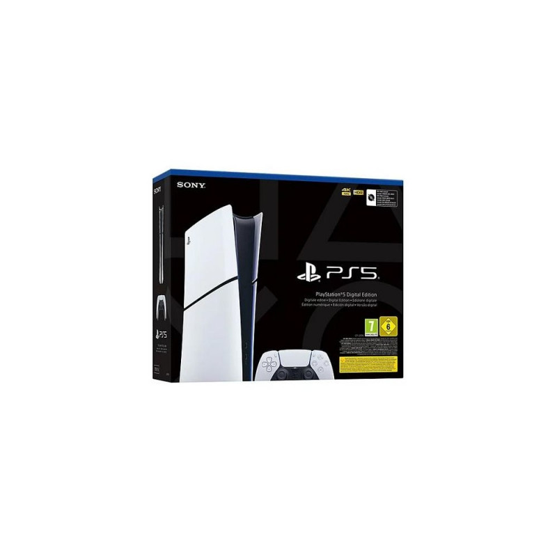 <b>Play like never before</b><br>Experience lightning-fast loading with an ultra-high speed SSD, deeper immersion with support for haptic feedback1, adaptive triggers and 3D Audio, and an incredible collection of PlayStation games.<br><br><b>Stunning games</b><br>Explore spectacular new worlds in generation-defining games exclusive to PlayStation consoles.<br><br><b>Lightning speed</b><br>Jump into the action and keep play moving with ultra-fast, integrated console technology.<br><br><b>Breathtaking immersion</b><br>Put yourself at the heart of the game with responsive controls, 360-degree audio1, and intricate graphical detail.<br><br><b>Stunning games on PS5</b><br>Immerse yourself in games that look and sound stunning, including console exclusives from PlayStation Studios and full backwards compatibility for your PS4 library.<br><br><b>PS5 console exclusives</b><br>Experience generation-defining games from PlayStation Studios.<br><br><b>Play the biggest games on PlayStation</b><br>Join millions of players in legendary titles like Fortnite, Monster Hunter Wilds, and Grand Theft Auto V.<br><br><b>Backwards compatible with PS4®</b><br>Play over 8,500 PS4 games on PS5 consoles. Enjoy faster and smoother frame rates in select PS4 games with PS5’s Game Boost technology.<br><br><b>On-demand games with PlayStation Plus</b><br>Join PlayStation Plus and enjoy instant access to a huge library of PS5 and PS4 games that evolves every month, with a choice of membership plans2 to suit how you play.<br><br><b>Spectacular visuals at lightning speed</b><br>Harness the might of a custom CPU, GPU and SSD that deliver breathtaking graphics and smooth gameplay.<br><br><b>Near instant load times</b><br>An ultra-high-speed SSD maximises your play sessions for installed PS5 games.<br><br><b>Next level game design</b><br>The custom integration of the PS5 console’s systems lets creators pull data from the SSD so quickly that they can design games in ways never before possible.<br><br><b>1TB of storage</b><br>Keep your favourite games ready and waiting for you to jump in and play with 1TB of SSD storage built in5.<br><br><b>Explore lifelike environments with Ray Tracing</b><br>Ray Tracing brings new levels of realism with natural shadows and reflections in supported PS5 games.<br><br><b>Vibrant colours & crisp 4K graphics</b><br>Intricate details come to life with your 4K TV and compatible PS5 games. With an HDR TV, supported PS5 games pop with an unbelievable range of colours.<br><br><b>Navigate game worlds with incredible responsiveness</b><br>Smooth and fluid high-frame-rate gameplay for compatible games.<br><br><b>Immersive play with the DualSense® wireless controller</b><br>Discover a deeper gaming experience* with the incredibly tactile features of the innovative PS5 controller.<br>*Compared to DUALSHOCK®4 wireless controller<br><br><b>Adaptive Triggers</b><br>Dynamic resistance mimics the tension of interactions with in-game gear and objects in select PS5 games.<br><br>From pulling back an increasingly tight bowstring to hitting the brakes on a speeding car, feel physically connected to your on-screen actions.<br><br><b>Haptic Feedback</b><br>Responsive vibrations react to your in-game choices and simulate environmental factors in select PS5 games.<br><br>In your hands, these dynamic vibrations can simulate the feeling of everything from environments to the recoil of different weapons.<br><br><b>Enhance your perception with 3D Audio</b><br>From the distant calls of teammates to the nearby approach of sneaking predators, your surroundings come alive with Tempest 3D AudioTech through TV speakers or compatible headphones in supported games.<br><br><b>PS5 accessories</b><br>Build your ultimate PS5 setup with additional controllers and matching console<br>covers, audio headsets and more.<br><br><b>PlayStation Portal™ remote player</b><br>Feel the power of PlayStation in the palm of your hand as you play your PS5 console over your home Wi-Fi4 with console-quality controls and a gorgeous 8-inch built-in display.<br><br><b>Stay connected with PlayStation™ App</b><br>Bring your PS5 experience with you wherever you go with the companion PlayStation App. Stay in touch with PlayStation™ Network friends via text and voice chat, view your media gallery with Game Captures, purchase games via PlayStation™ Store, and more, all from the free app for Apple and Android devices.Sony PlayStation 5 (model group - Slim) Digital Edition. Platform: PlayStation 5, Product colour: Black, White, Internal memory: 16384 MB. Storage media: SSD, Internal storage capacity: 825 GB, Read speed: 5500 MB/s. Ethernet LAN data rates: 10,1000,100 Mbit/s, Ethernet interface type: Gigabit Ethernet, Wi-Fi standards: 802.11a, Wi-Fi 5 (802.11ac), 802.11b, Wi-Fi 6 (802.11ax), 802.11g, Wi-Fi 4 (802.11n). HD type: 8K Ultra HD, Supported video modes: 2160p, 4320p, Audio decoders: Dolby Digital Plus, DTS-HD Master Audio 5.1, DTS, DTS 2.0, DTS 5.1, Dolby Digital 5.1, DTS-HD,.... Harmonized System (HS) code: 9504 5000 00