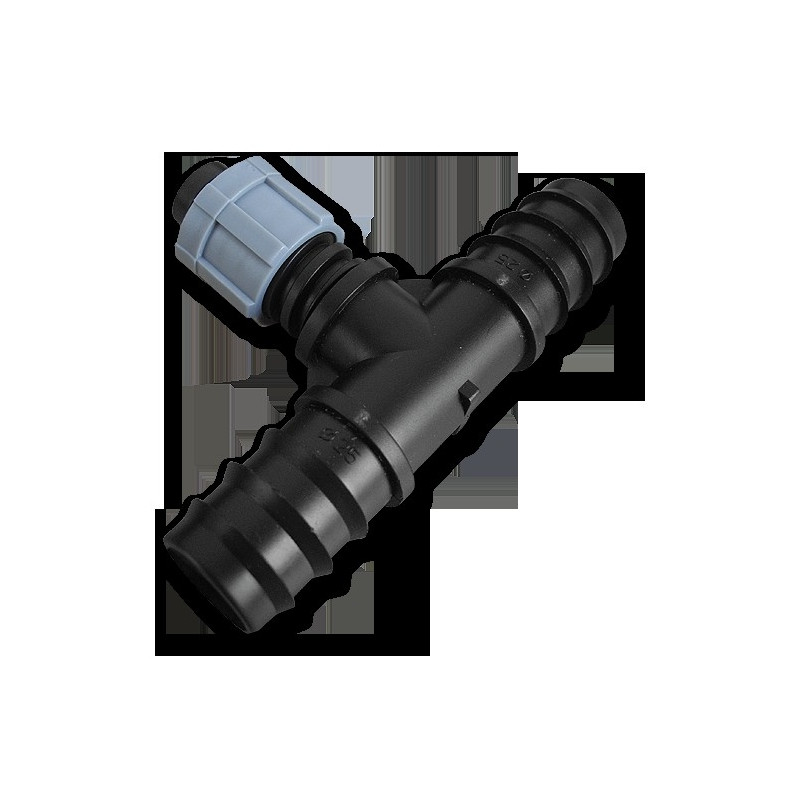 Tee with connector for drip tape and two 25mm hose barbs.Products available in 25 pcs bag.