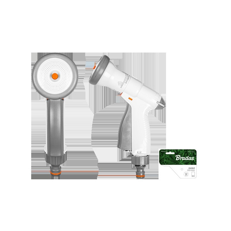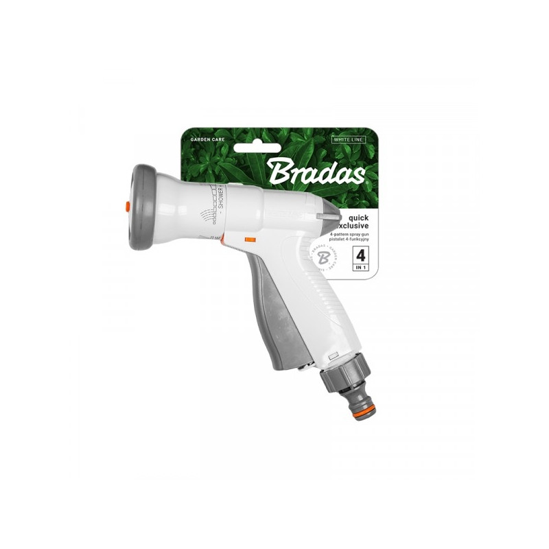 Multi-function «EXCLUSIVE» spray gun. «Pressing» construction to switch on and off by single hand and water flow adjustable function - patented by manufacturer. It is made of high impact grade plastic ABS. The quality is tested by air checking machine. 2 years guarantee. Available in grey-white color. Each WHITE LINE product has a label with description and barcode.