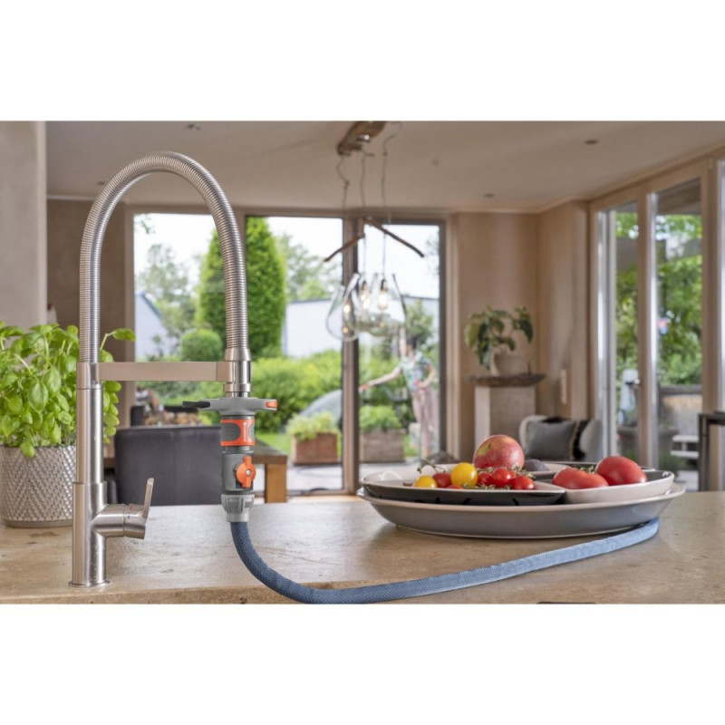 In addition to the Liano Xtreme, the set includes a GARDENA Sprayer, a Liano Indoor Hose Connector with regulating valve, a Liano Water Stop and a Tap Connector for indoor taps. The installation of the hose to an indoor water tap works with a few simple steps.