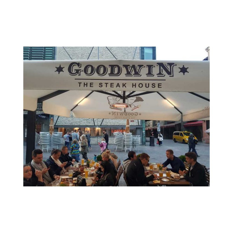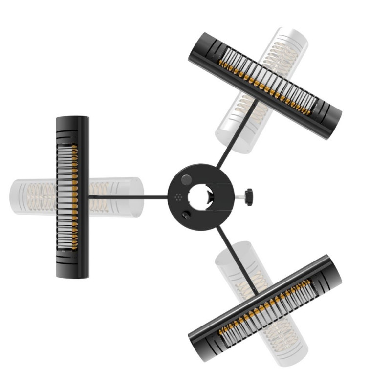 ULG heating element infrared heater - strong heat effect, cozy orange light tone! - ultra low glare. The lantern-type infrared heater, which mounts to a post, is suitable for outdoor use on home terraces, verandas, restaurants, and café terraces above tables. The heater is especially suitable for use under large sunshades or umbrellas. All three heaters are individually adjustable and can be rotated as desired. They each have separate remote controls for on/off operation. Also suitable for indoor use.